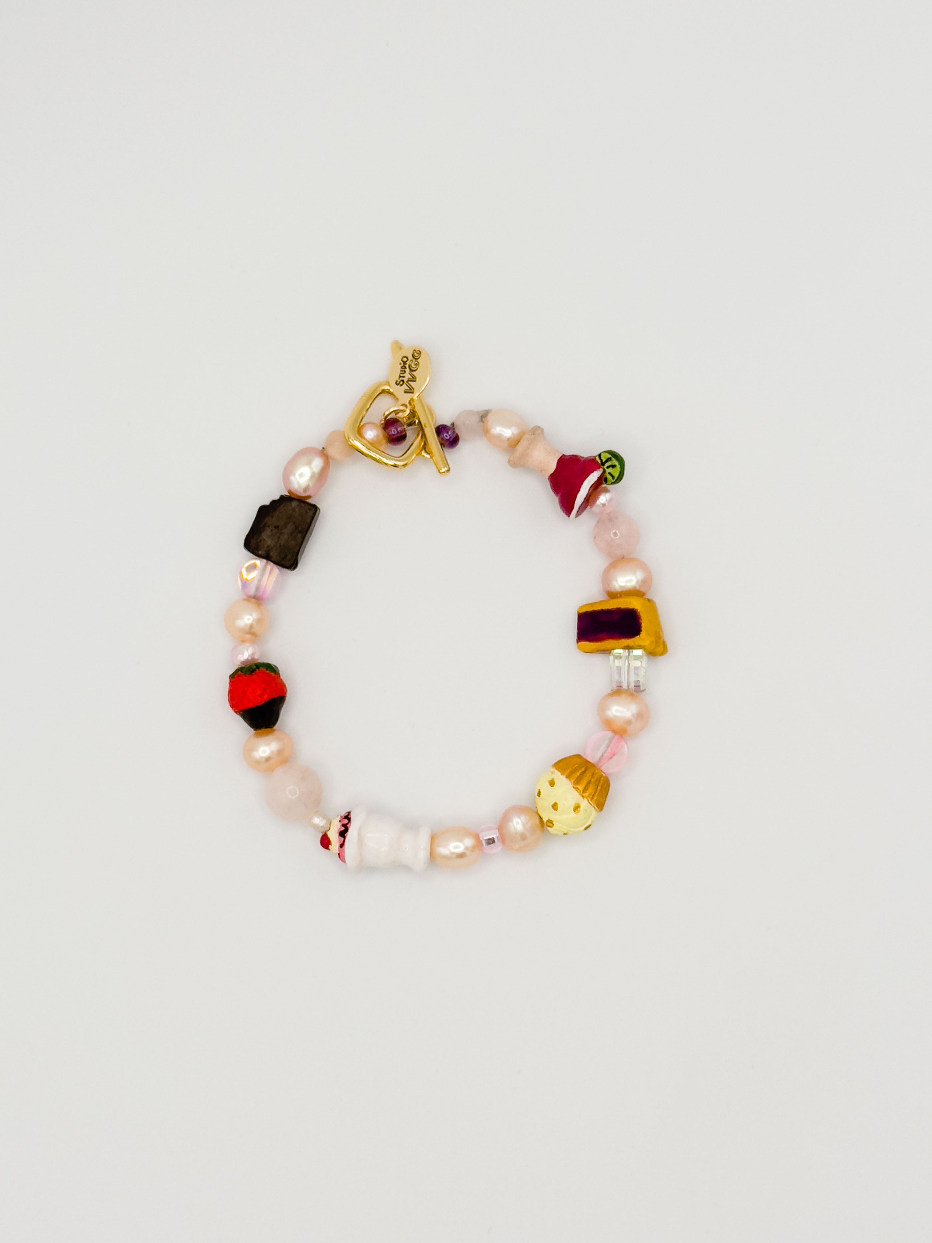 A hand-selected curation of pink freshwater pearls & hand painted ceramic beads strung on braided metal wiring. Hardware is a gold toned nickel-free toggle clasp that is skin-safe and hypoallergenic. 8.15" in length (clasp included)