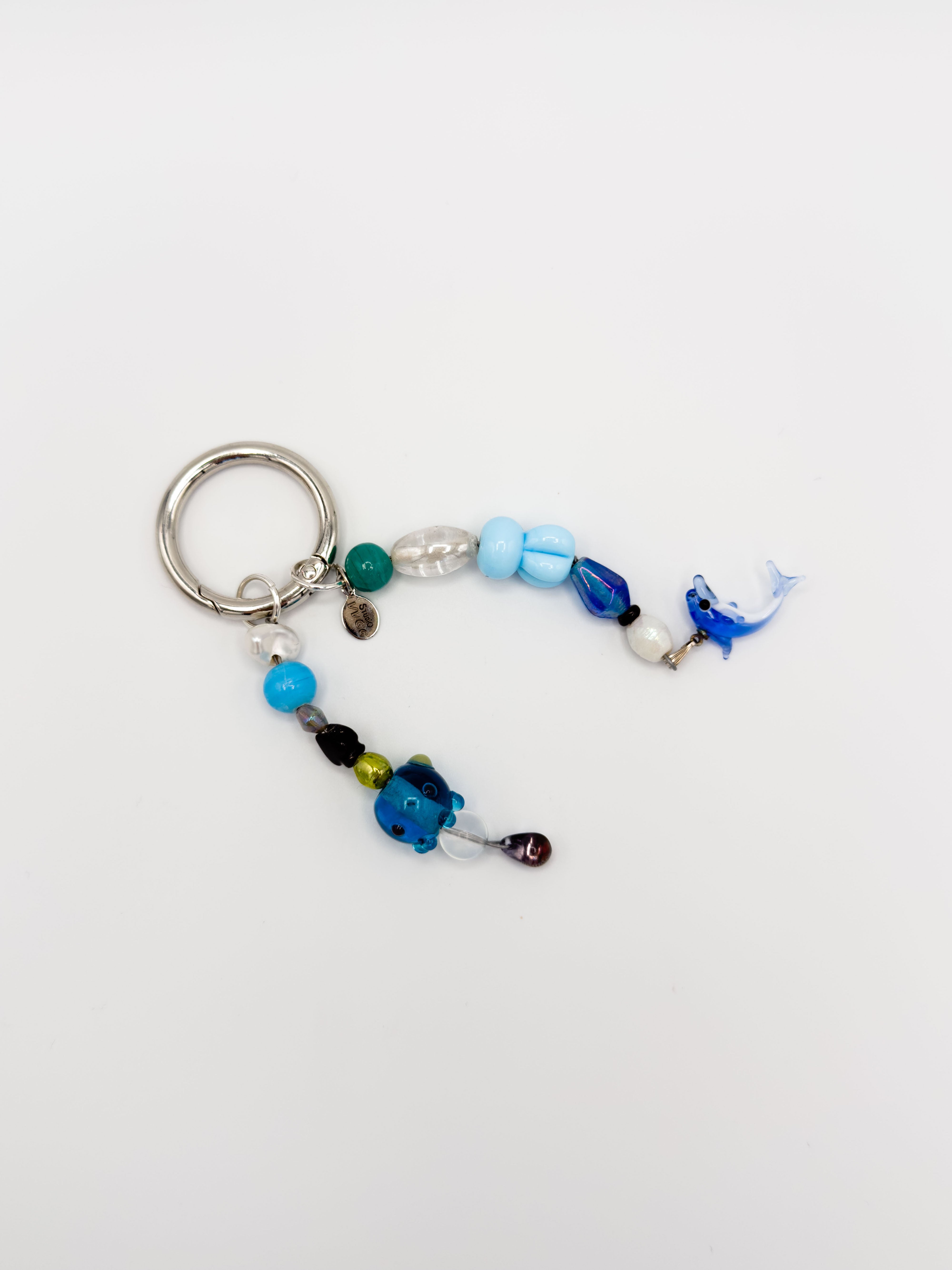 This one is named Saltwater. The silver snap keyring is 1" diameter on the inside, 1.15" on the outside. The shorter strand is 2.5" and the long strand is 3.25" making the keychain 4.75" top to bottom. Strung on 0.36mm braided metal wiring. The beads and charms used are vintage carnival glass, glass lampwork, polished agate, ceramic, porcelain and freshwater pearl. Dolphin charm is glass lampwork.