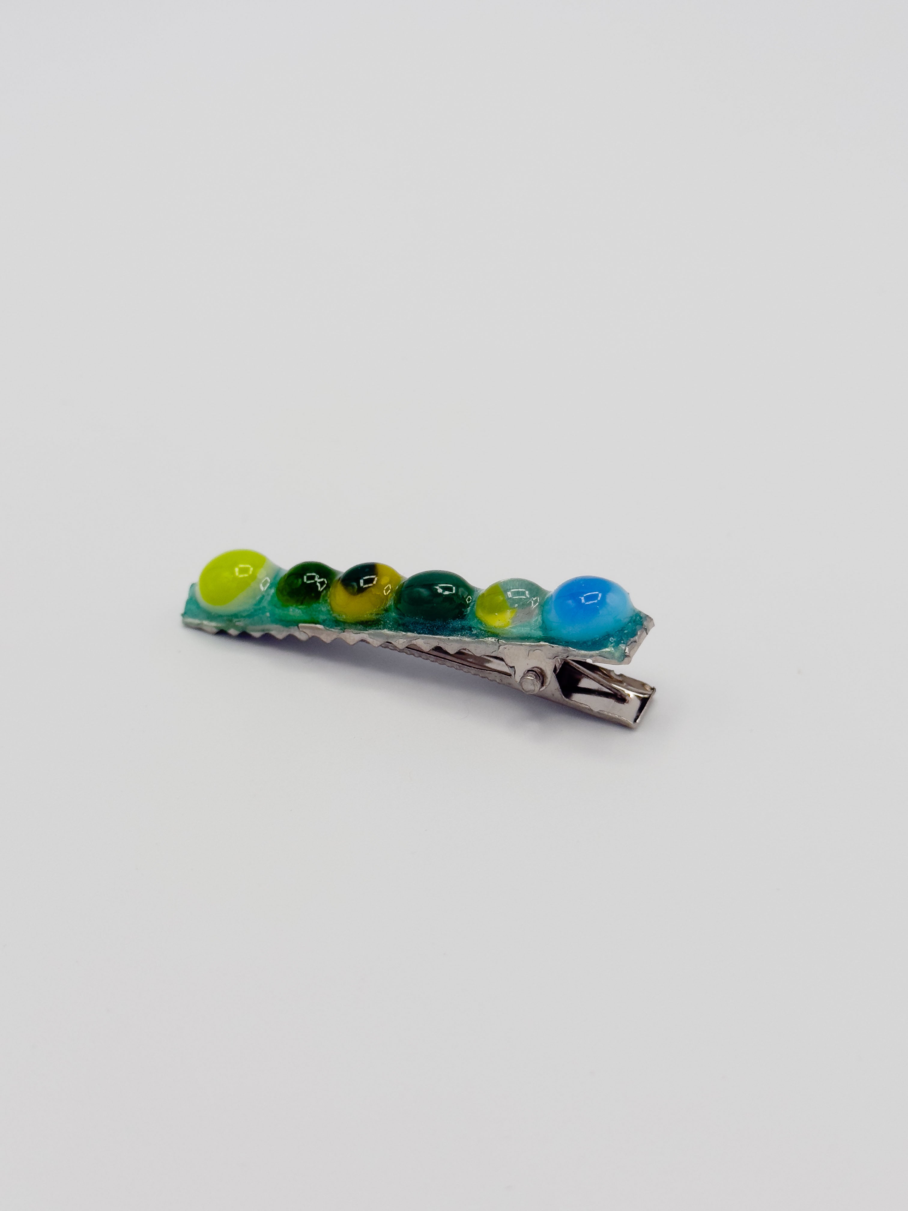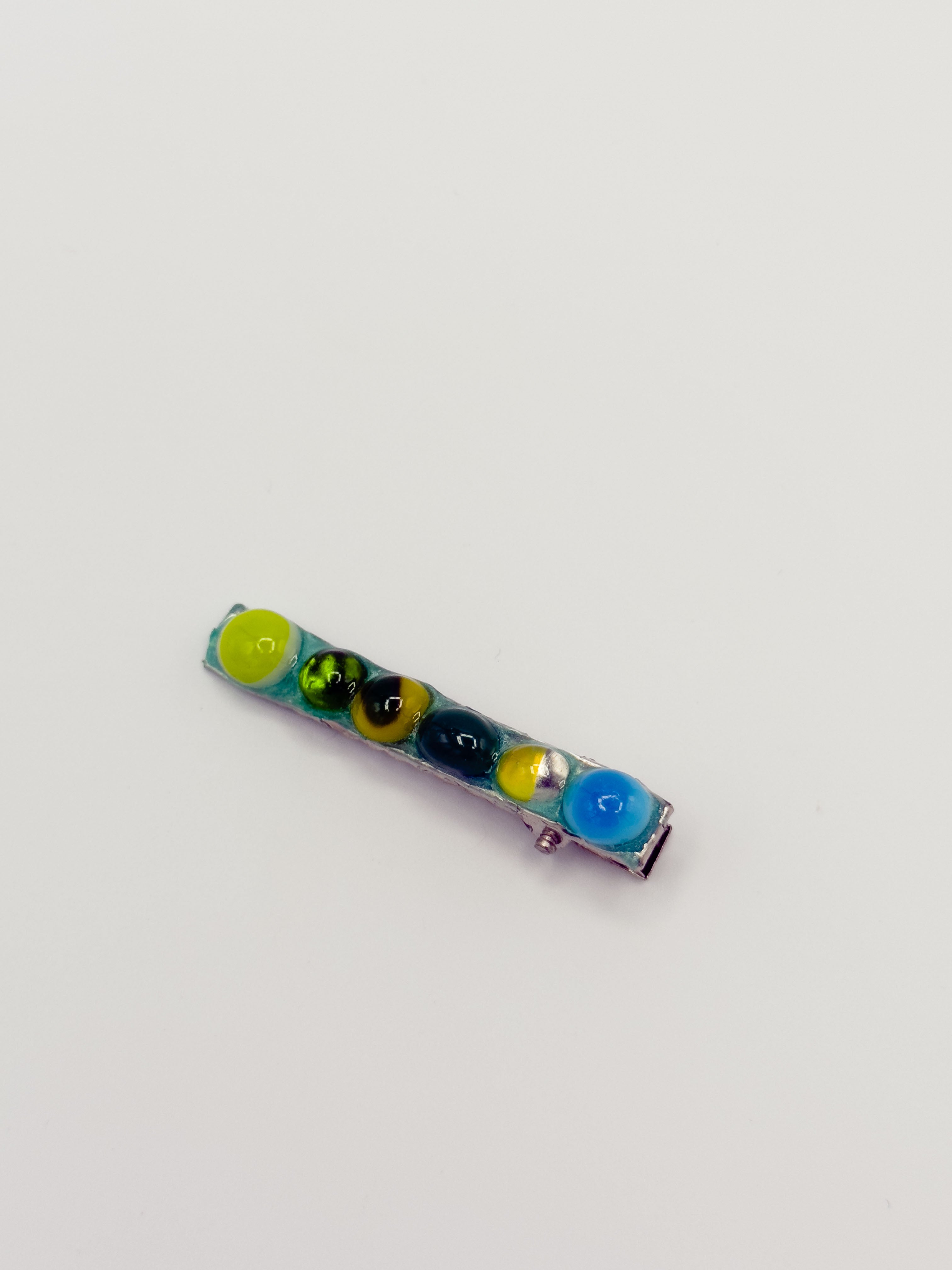 Fused glass dots placed neatly on top of a thick layer of sparkly teal base. Crafted on a silver-toned metal alligator clip. Coated in UV-cured resin to seal, protect, and add extra shine. Store out of sunlight when not in use, and do not wear in the shower - or any body of water - to preserve quality. 2.25" in length.