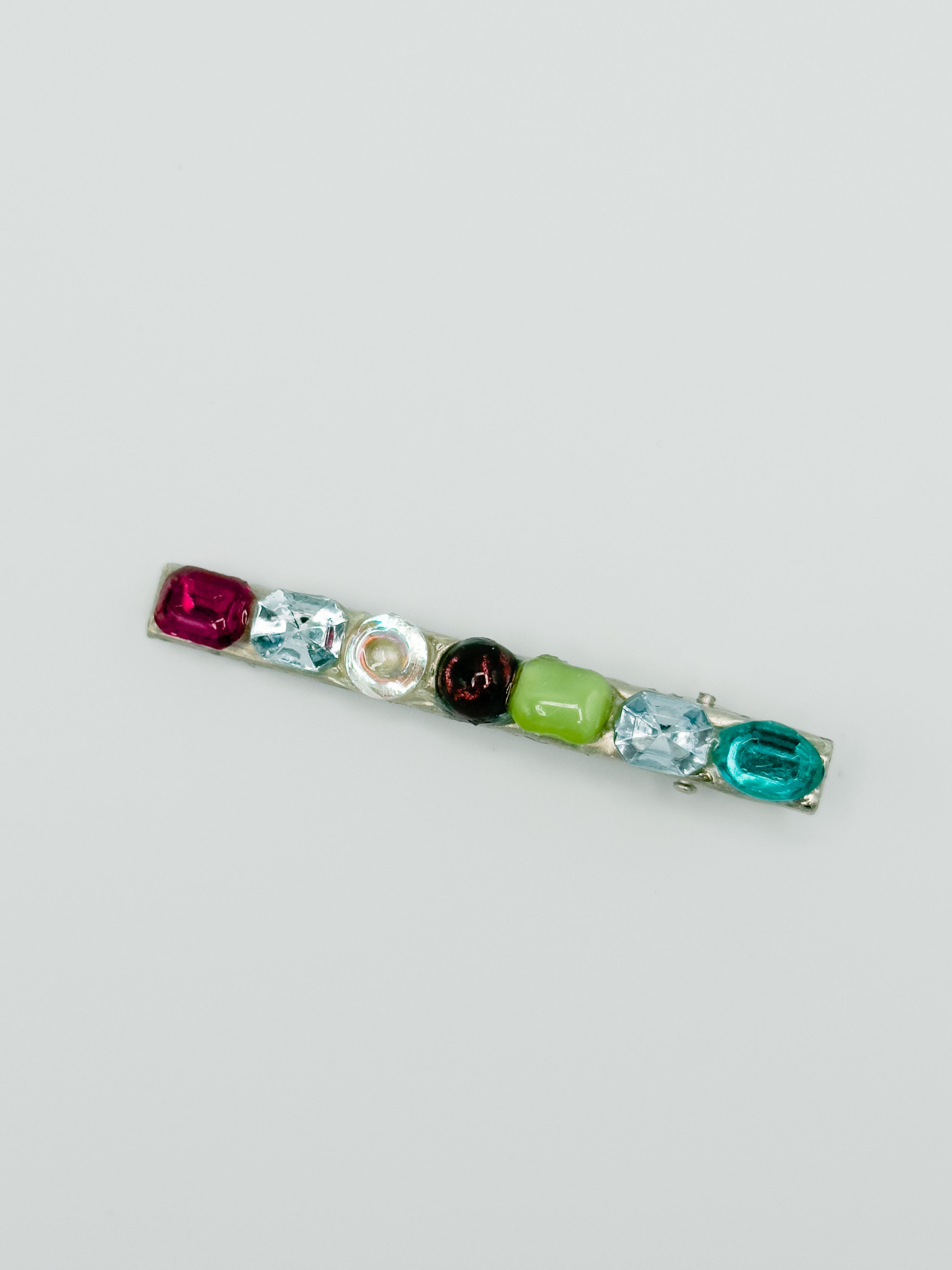 Vintage gems & cabochons placed thoughtfully on top of a layer of sparkly champagne yellow base. Crafted on a silver-toned metal alligator clip. Coated in UV-cured resin to seal, protect, and add extra shine. Store out of sunlight when not in use, and do not wear in the shower - or any body of water - to preserve quality. 3" in length.