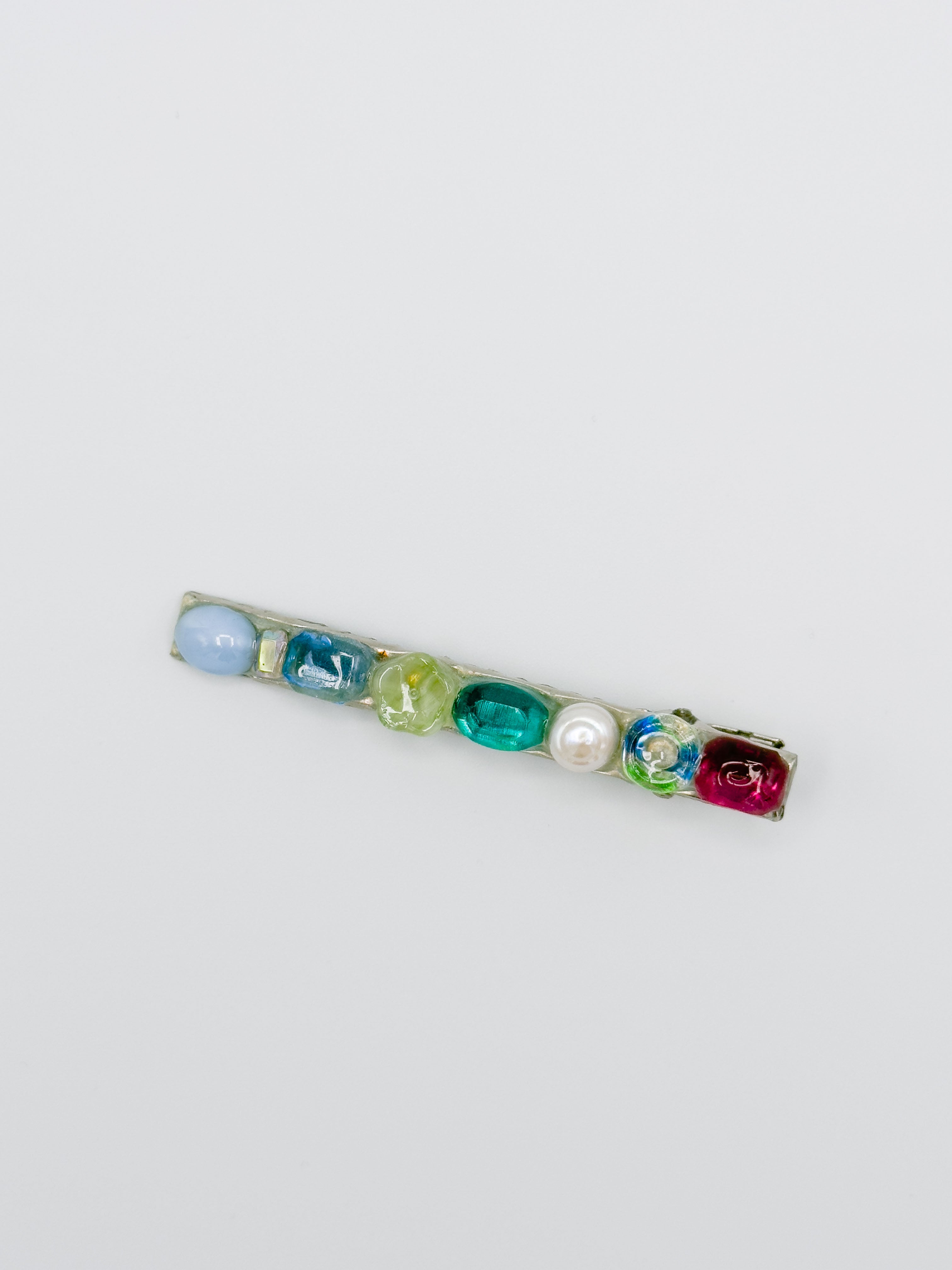 Vintage gems, cabochons, freshwater pearls and rhinestones placed thoughtfully on top of a layer of translucent sparkly beige base. Crafted on a silver-toned metal alligator clip. Coated in UV-cured resin to seal, protect, and add extra shine. Store out of sunlight when not in use, and do not wear in the shower - or any body of water - to preserve quality. 3" in length.