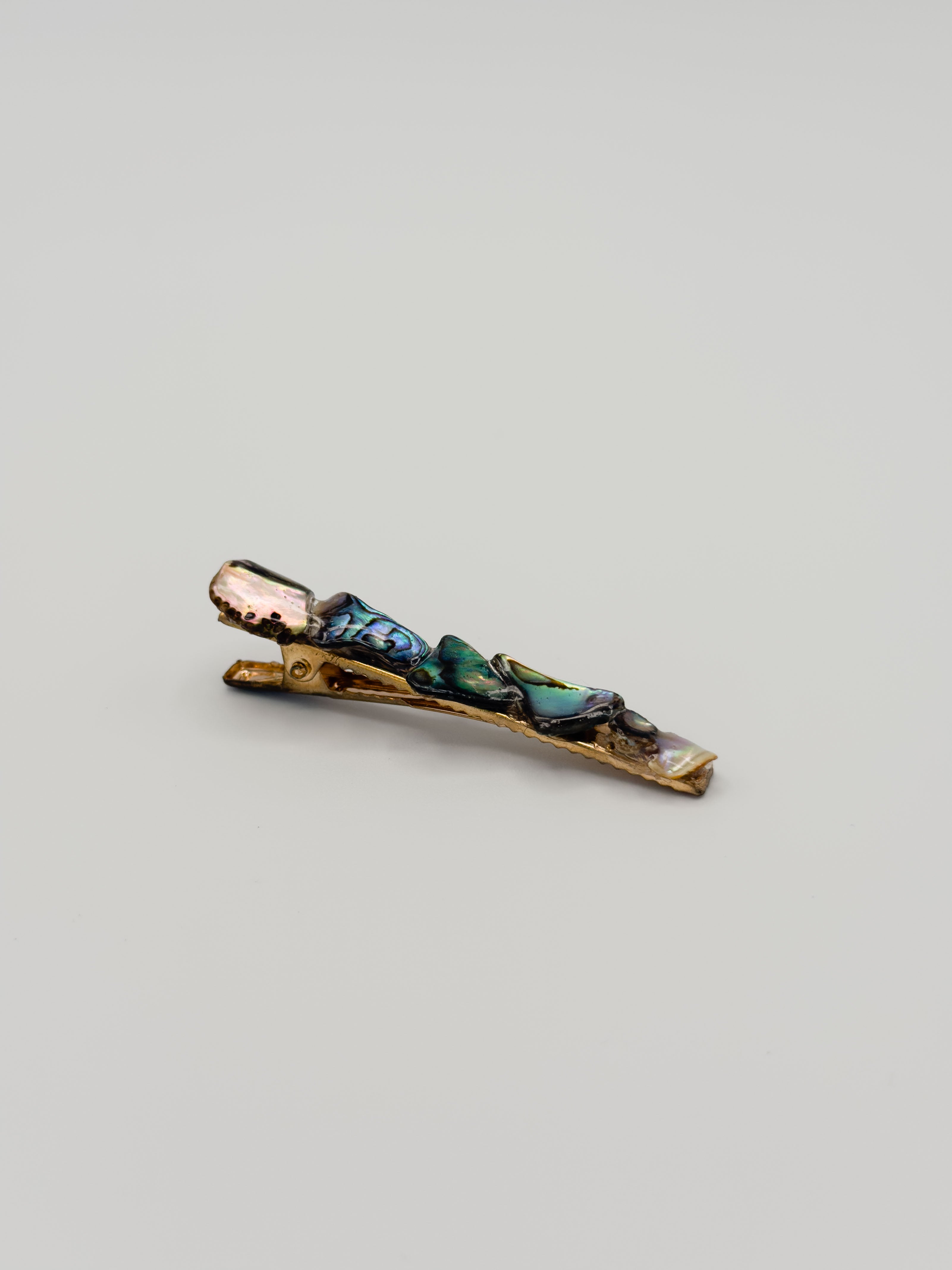 Tumbled abalone chips arranged atop gold-toned alligator barrettes. Coated in UV-cured resin to seal, protect, and add extra shine. Store out of sunlight when not in use, and do not wear in the shower - or any body of water - to preserve quality. Each barrette is 2 inches in length.