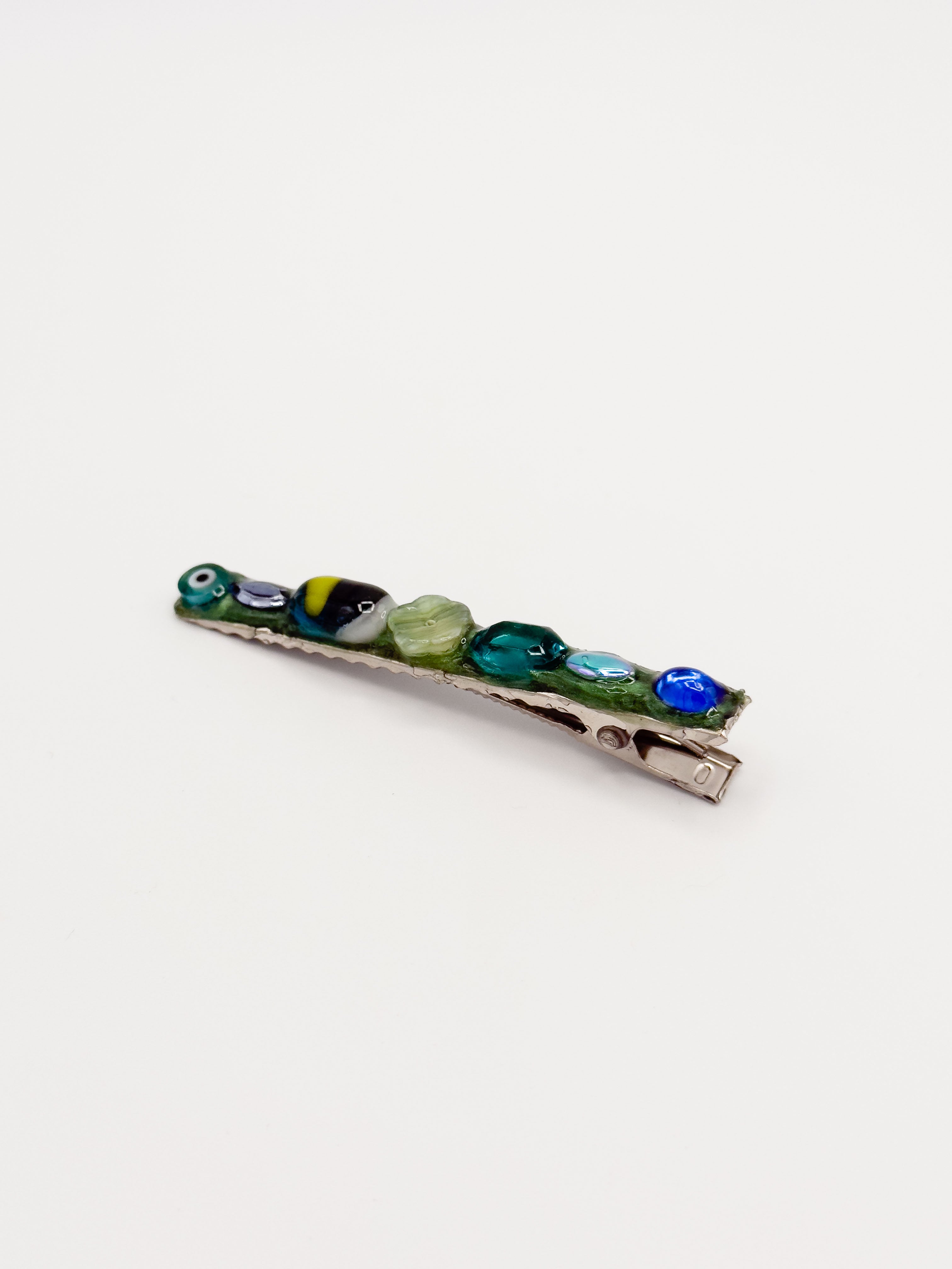 Vintage gems, fused glass dots, millefiori slices and rhinestones placed thoughtfully on top of a thick layer of sparkly forrest green base. Crafted on a silver-toned metal alligator clip. Coated in UV-cured resin to seal, protect, and add extra shine. Store out of sunlight when not in use, and do not wear in the shower - or any body of water - to preserve quality. 3" in length.