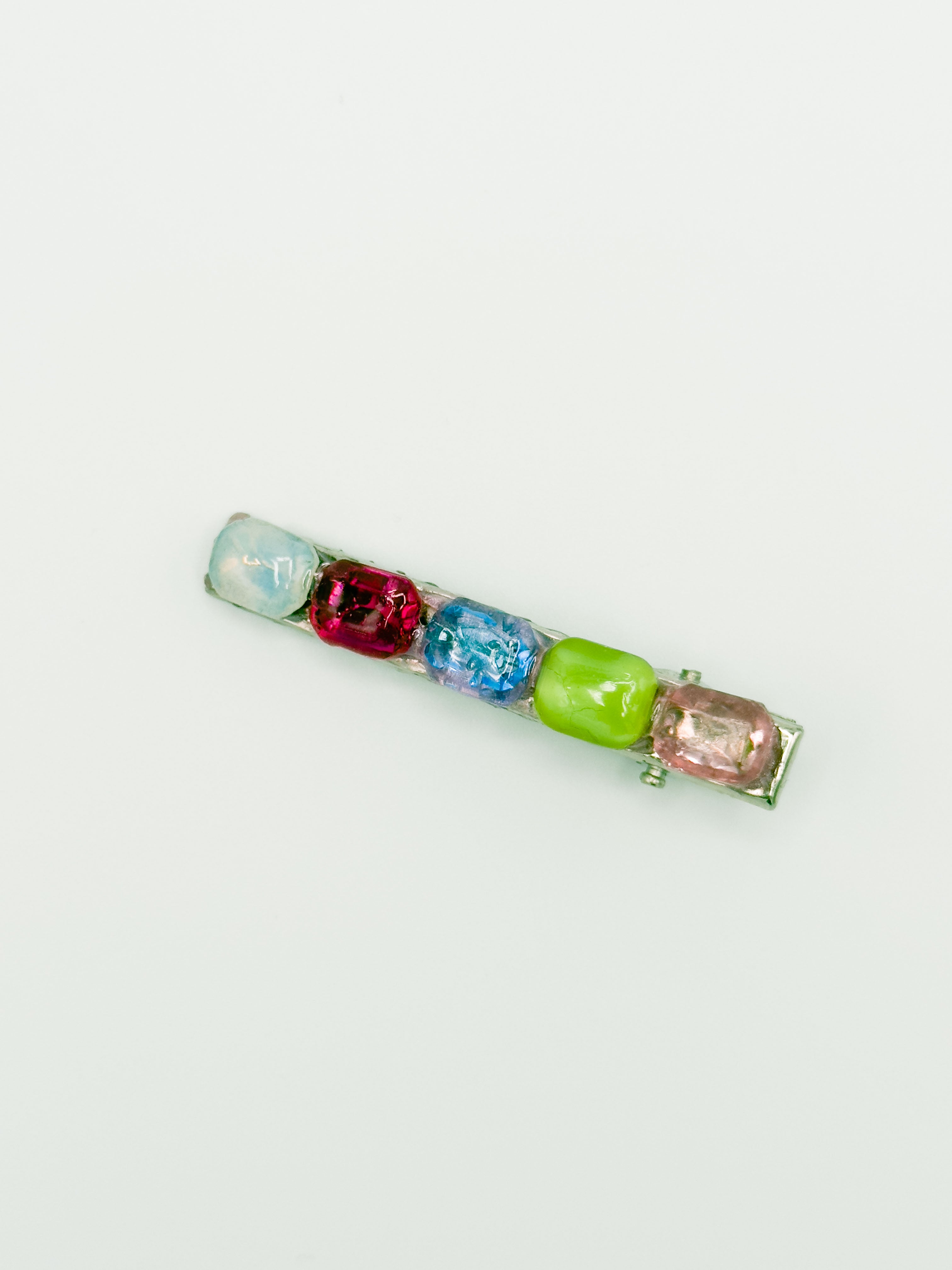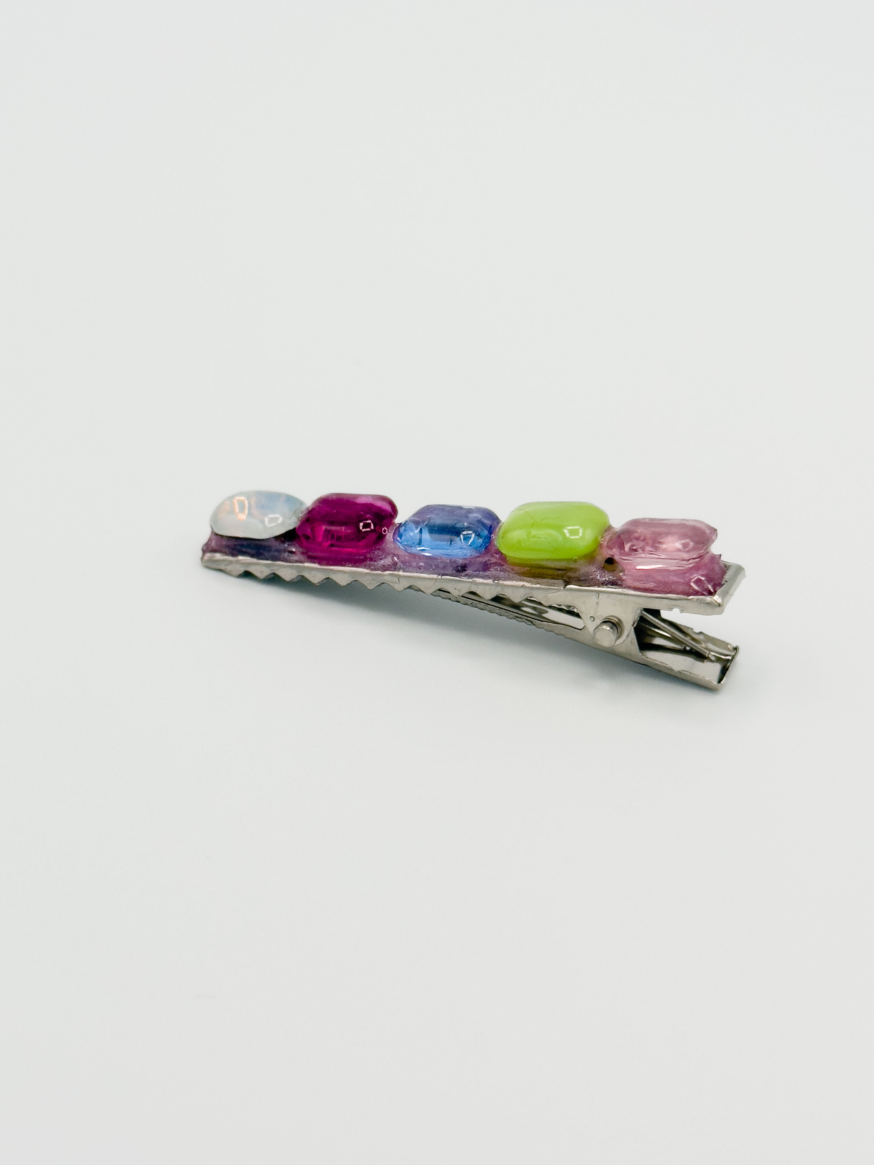 Vintage glass and acrylic gems placed thoughtfully on top of a thick layer of sparkly pink base. Crafted on a silver-toned metal alligator clip. Coated in UV-cured resin to seal, protect, and add extra shine. Store out of sunlight when not in use, and do not wear in the shower - or any body of water - to preserve quality. 2.38" in length.