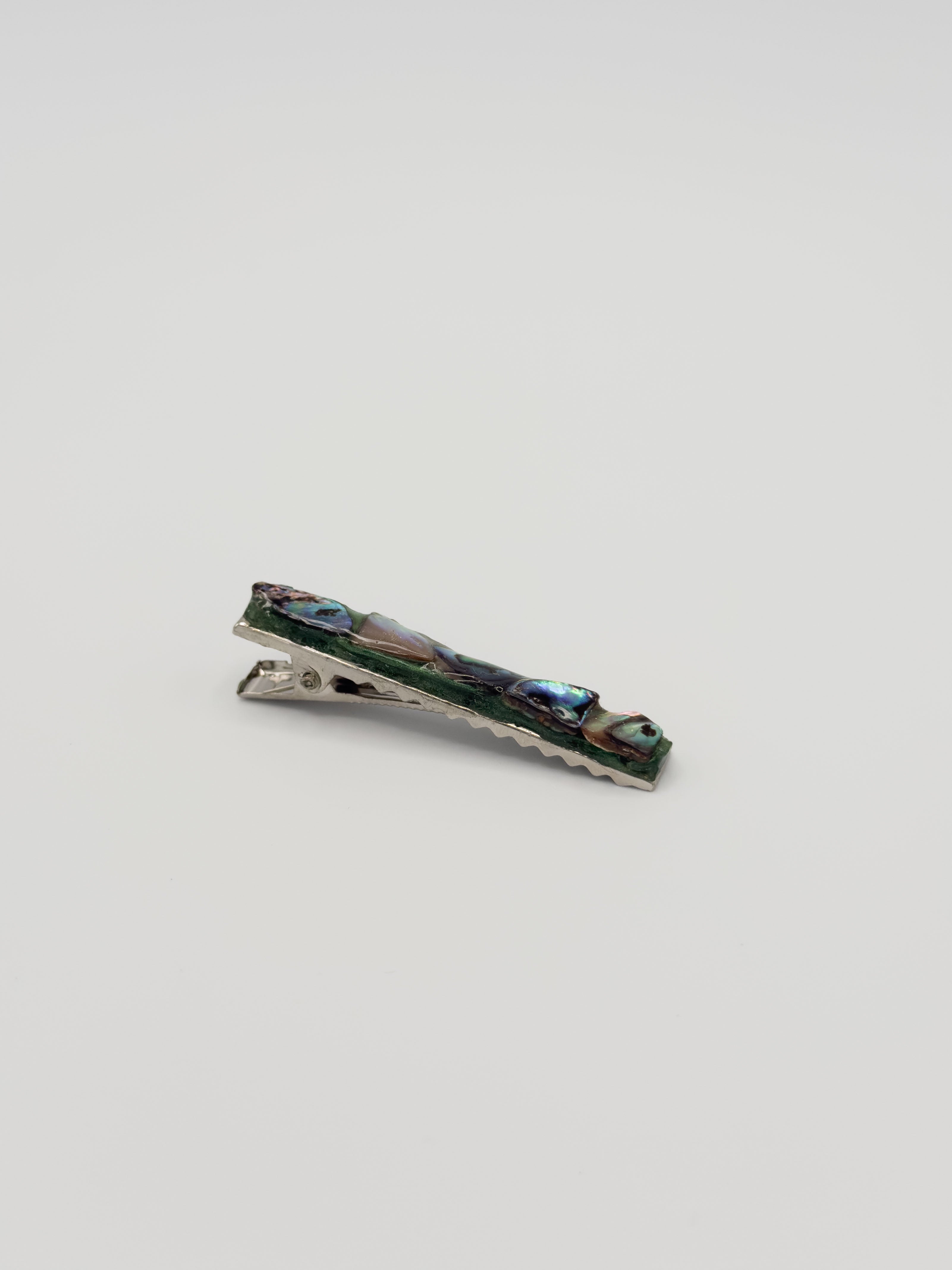 Tumbled abalone chips placed thoughtfully on top a thick layer of sparkly green base. Base is gold toned metal alloy alligator clip. Coated in UV-cured resin to seal, protect, and add extra shine. Store out of sunlight when not in use, and do not wear in the shower - or any body of water - to preserve quality. 2 inches in length.