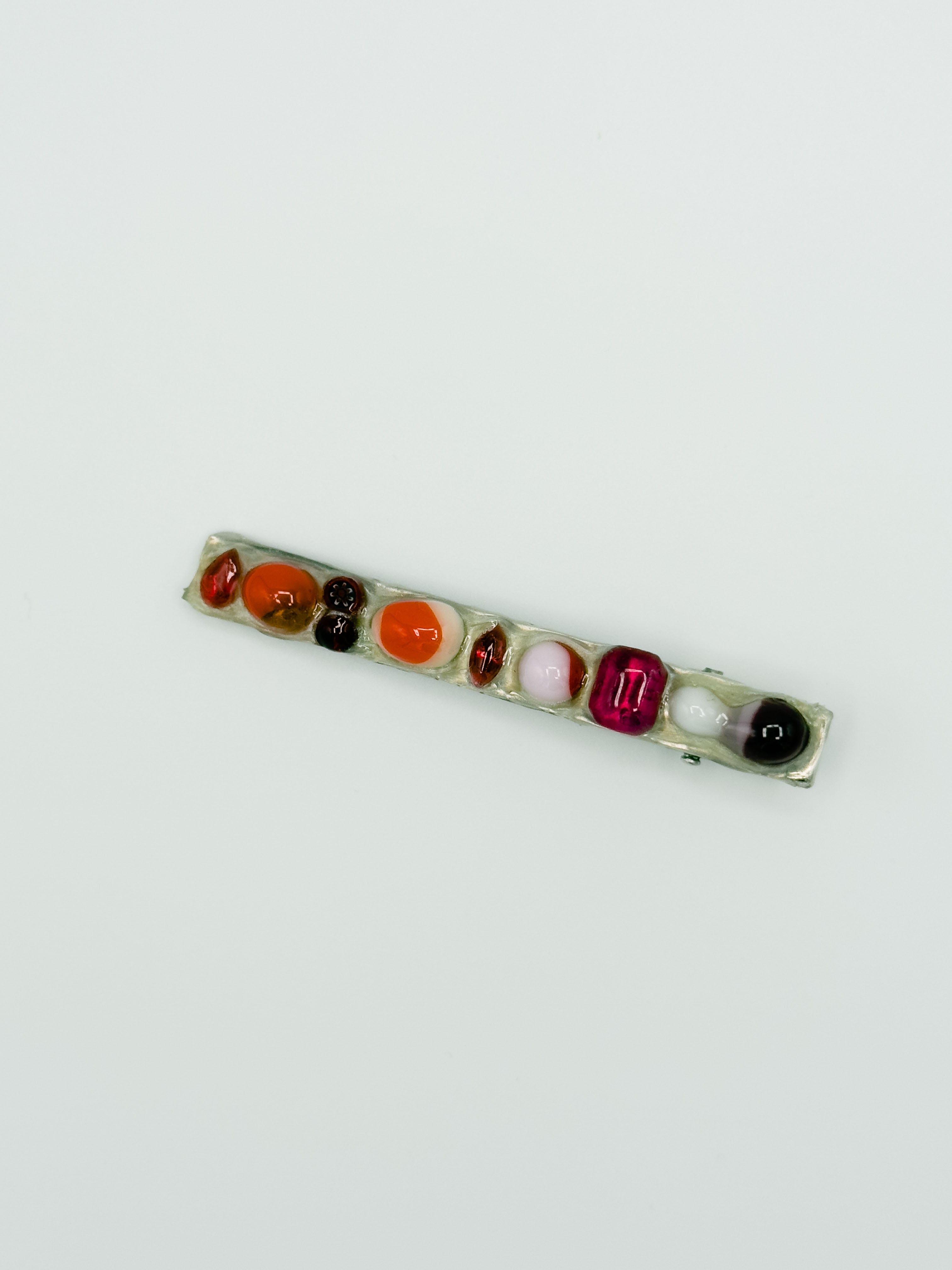 Fused glass dots, millefiori slices & vintage cabochons placed neatly on top of a thick layer of sparkly butter yellow base. Crafted on a silver-toned metal alligator clip. Coated in UV-cured resin to seal, protect, and add extra shine. Store out of sunlight when not in use, and do not wear in the shower - or any body of water - to preserve quality. 3.25" in length.