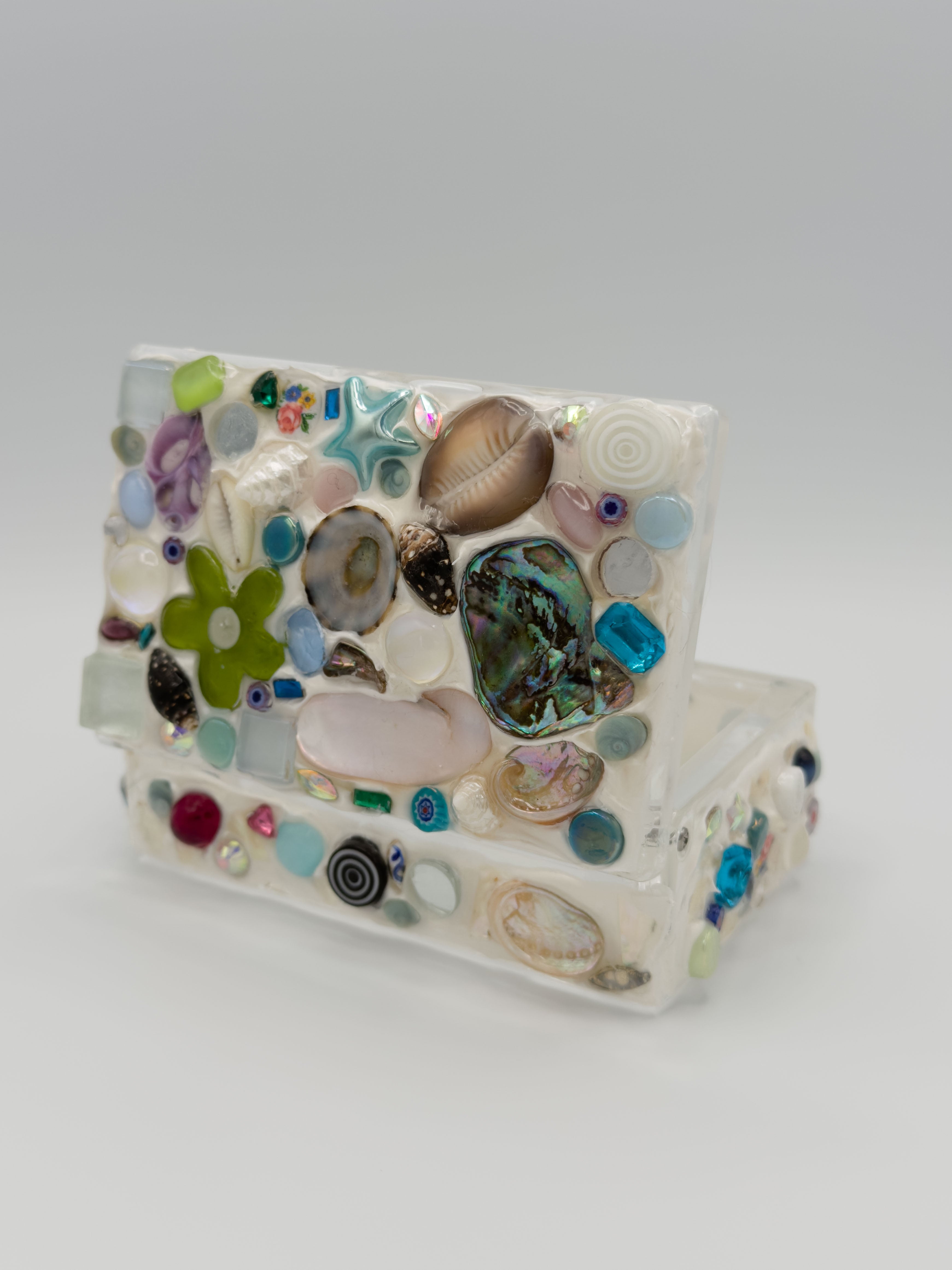 Adornments: Off-White Base, Misc Shells, Abalone Chips, Recycled Ceramic Tiles, Freshwater Pearls, Vintage Charms & Cabochons