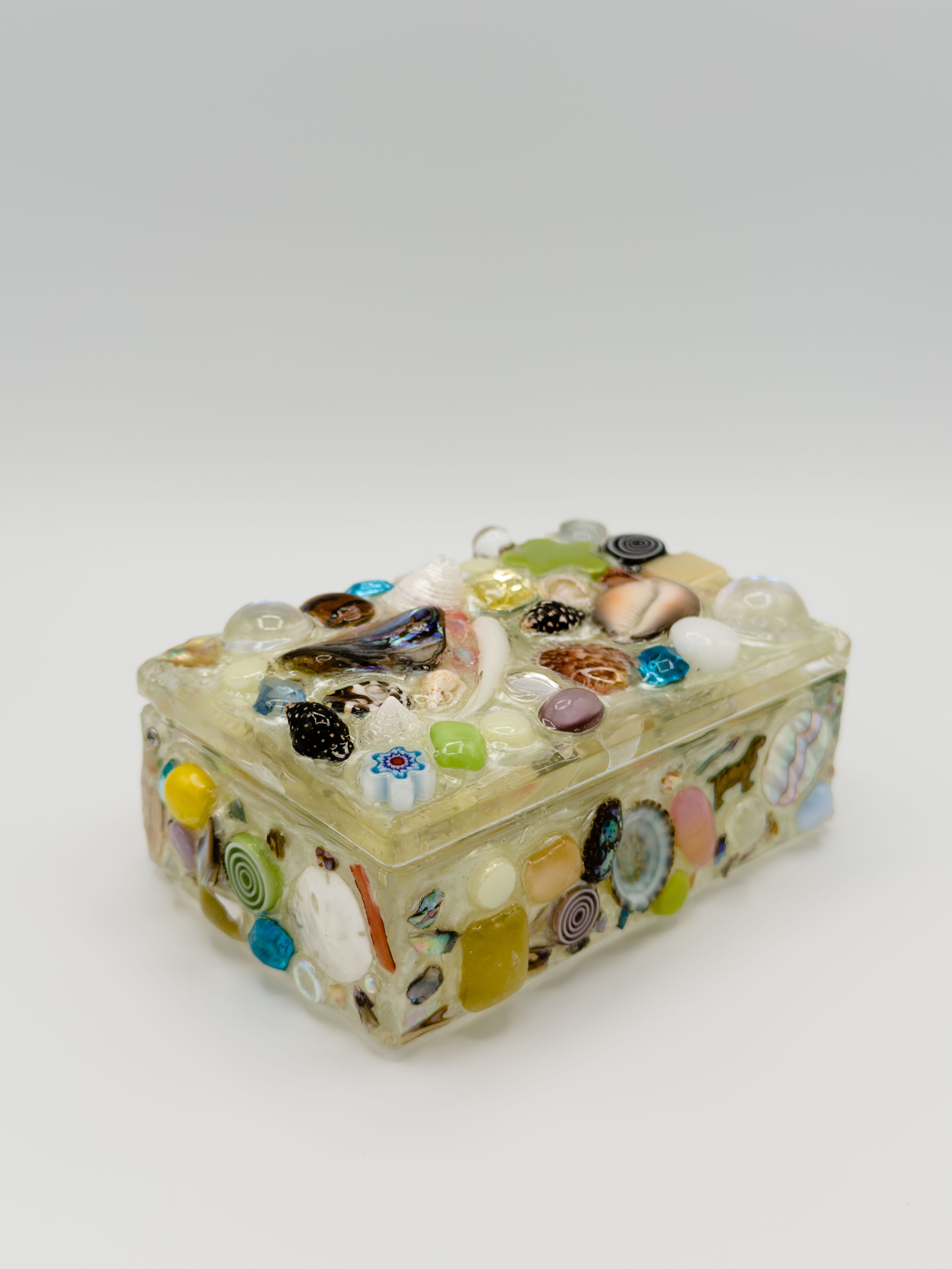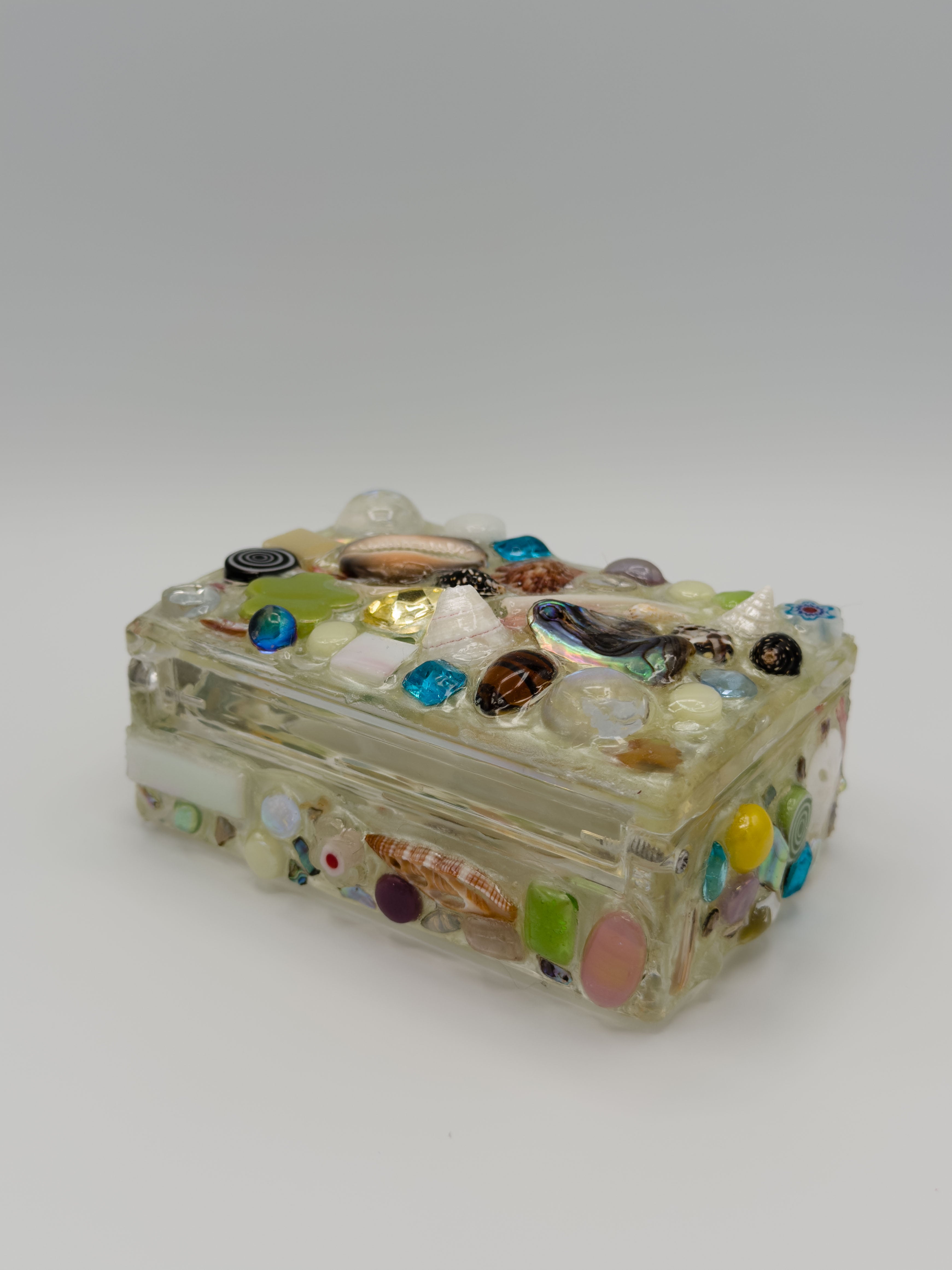 Specs: box is made of high grade acrylic. Dimensions are roughly 4'x3'x2' (may vary due to size of shells and gems). Coated in UV-cured resin. Not safe for food storage. Store out of direct sunlight to preserve quality. Tall/pointy shells are prone to breakage, be mindful of them!