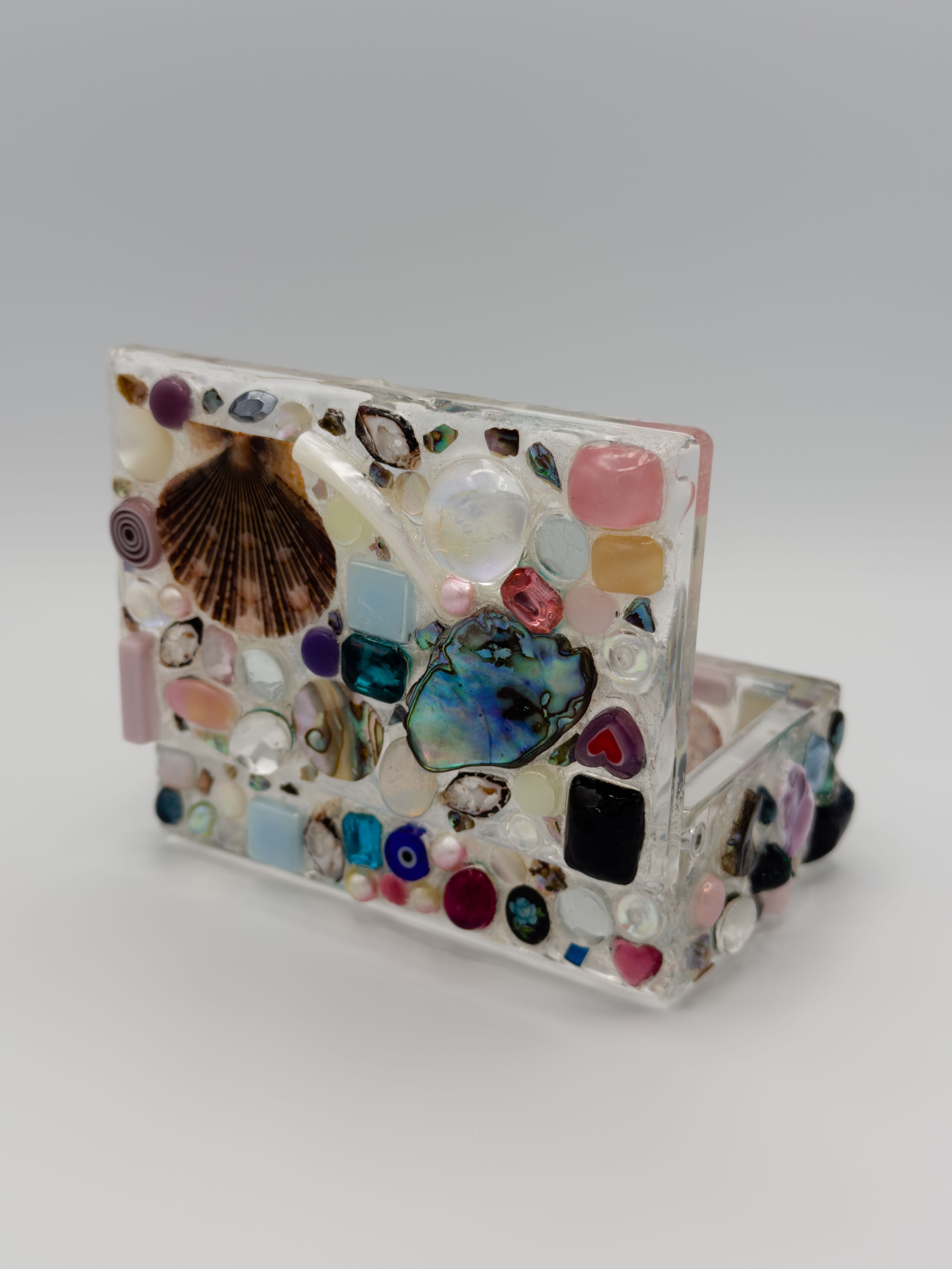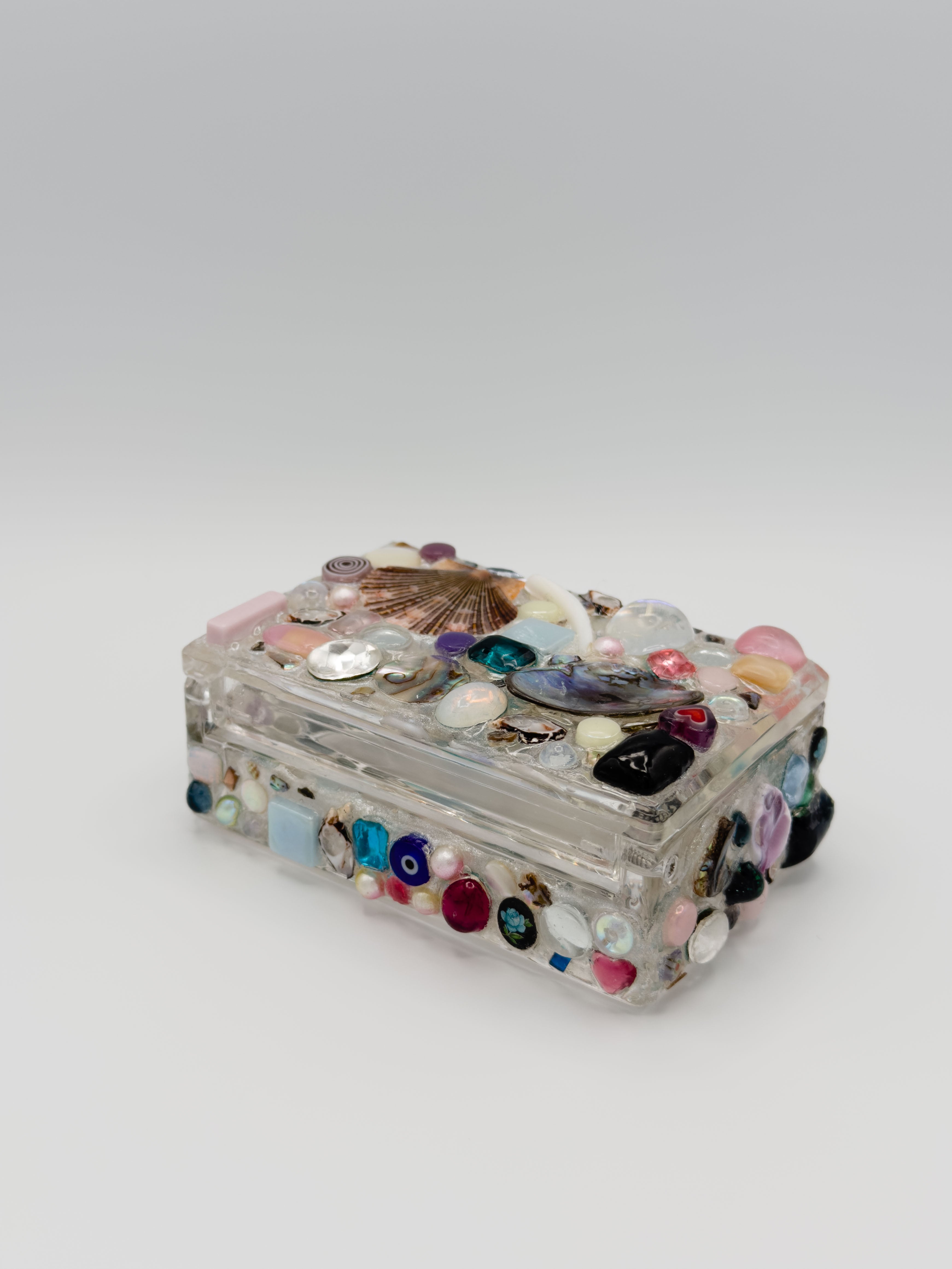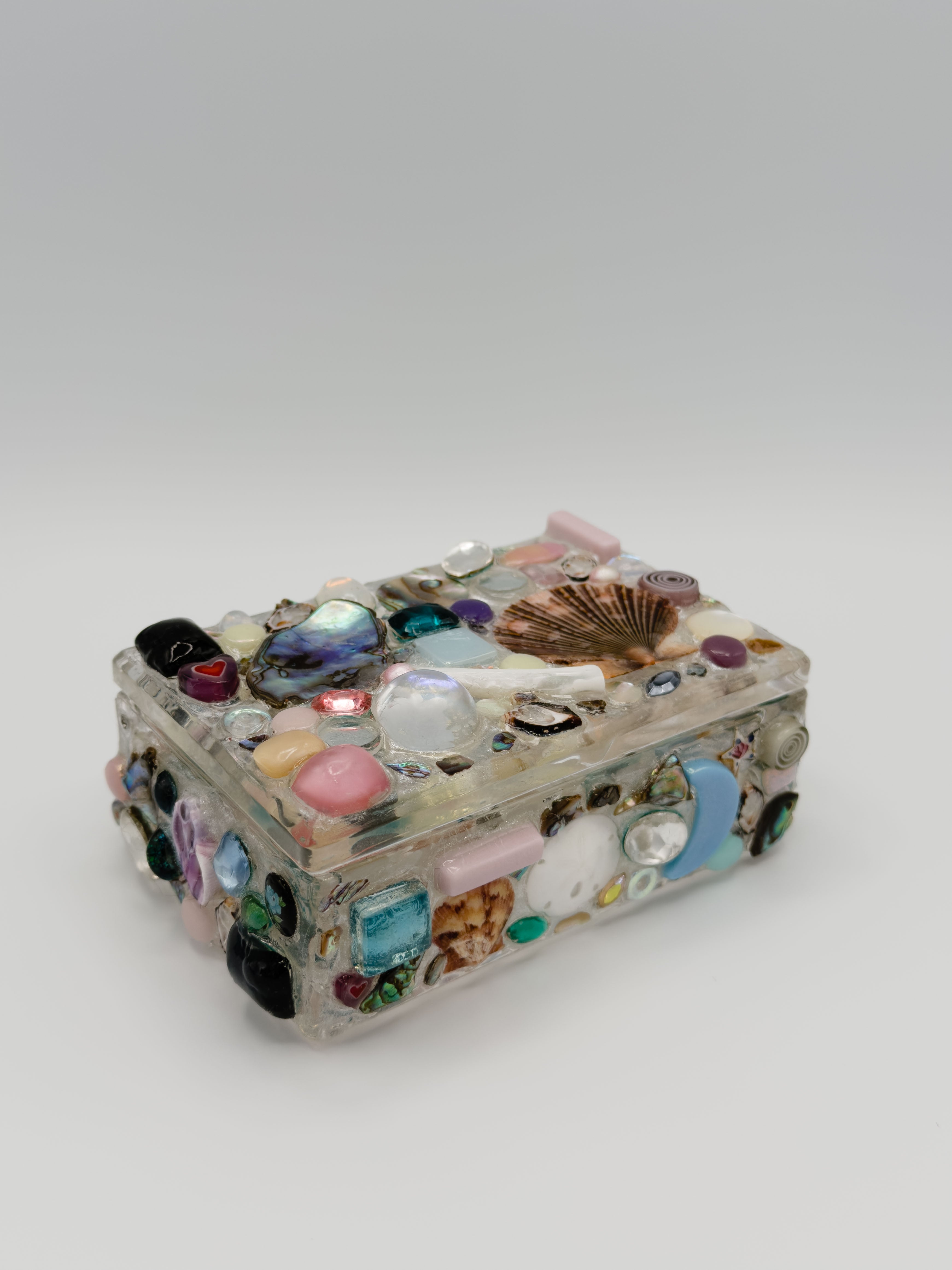 Specs: box is made of high grade acrylic. Dimensions are roughly 4'x3'x2' (may vary due to size of shells and gems). Coated in UV-cured resin. Not safe for food storage. Store out of direct sunlight to preserve quality. Tall/pointy shells are prone to breakage, be mindful of them!