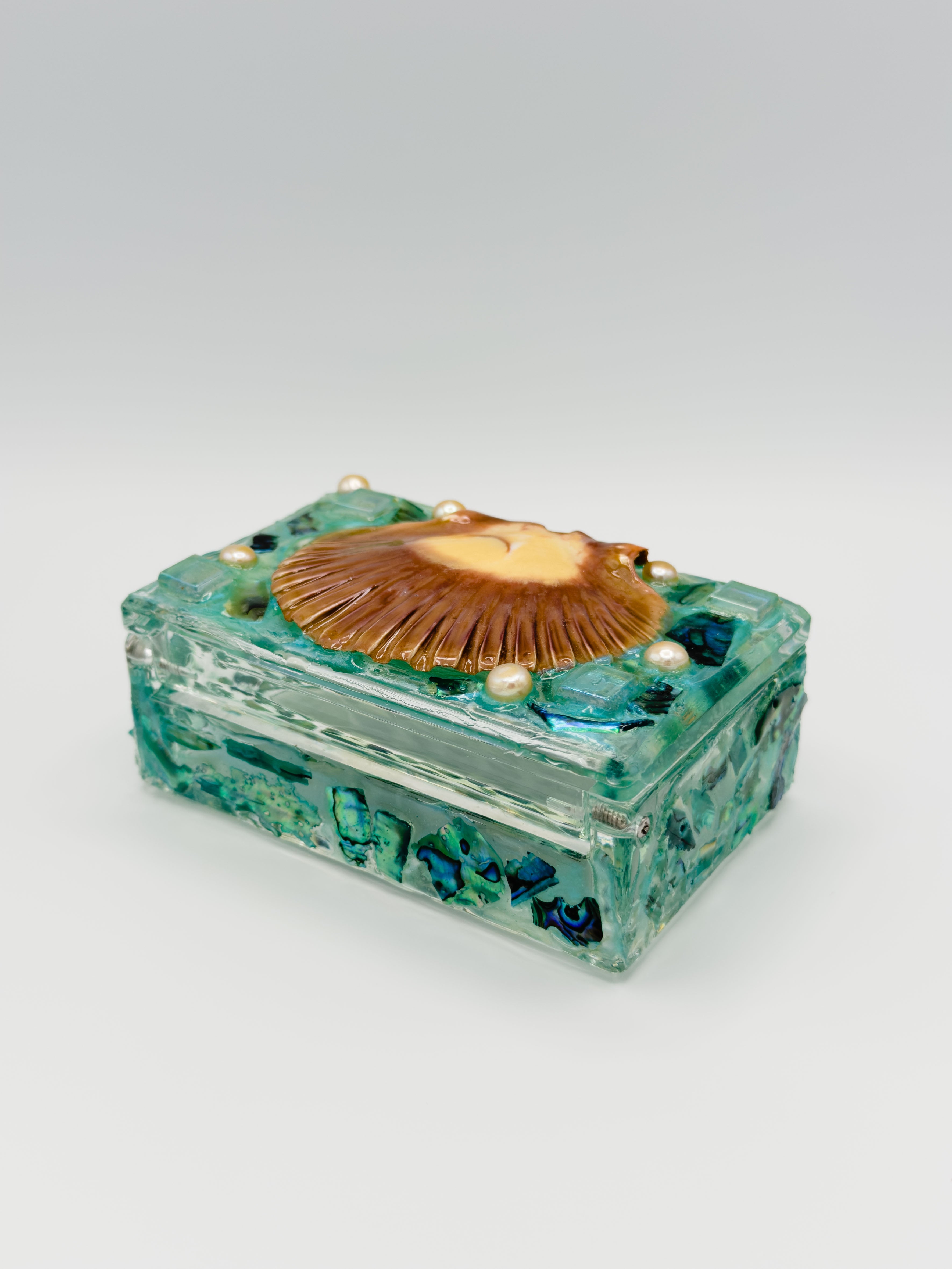 Adornments: Teal Sparkly Base, Indian Flat Scallop, Turquoise Tinted Abalone Chips, Freshwater Pearls, Iridescent Ceramic Tiles