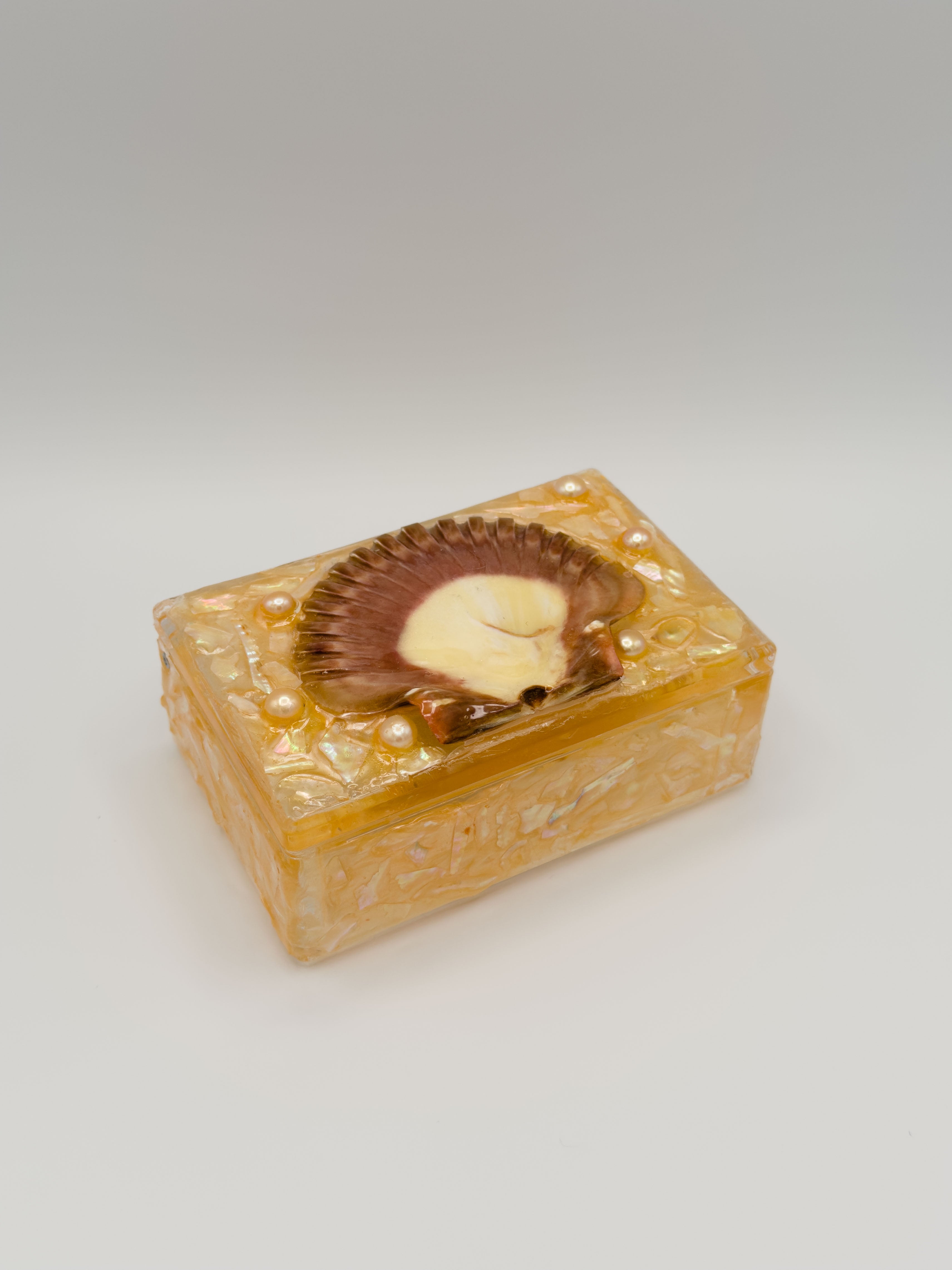 Adornments: Light Orange Sparkly Base, Indian Flat Scallop, Mother of Pearl Chips, Freshwater Pearls.