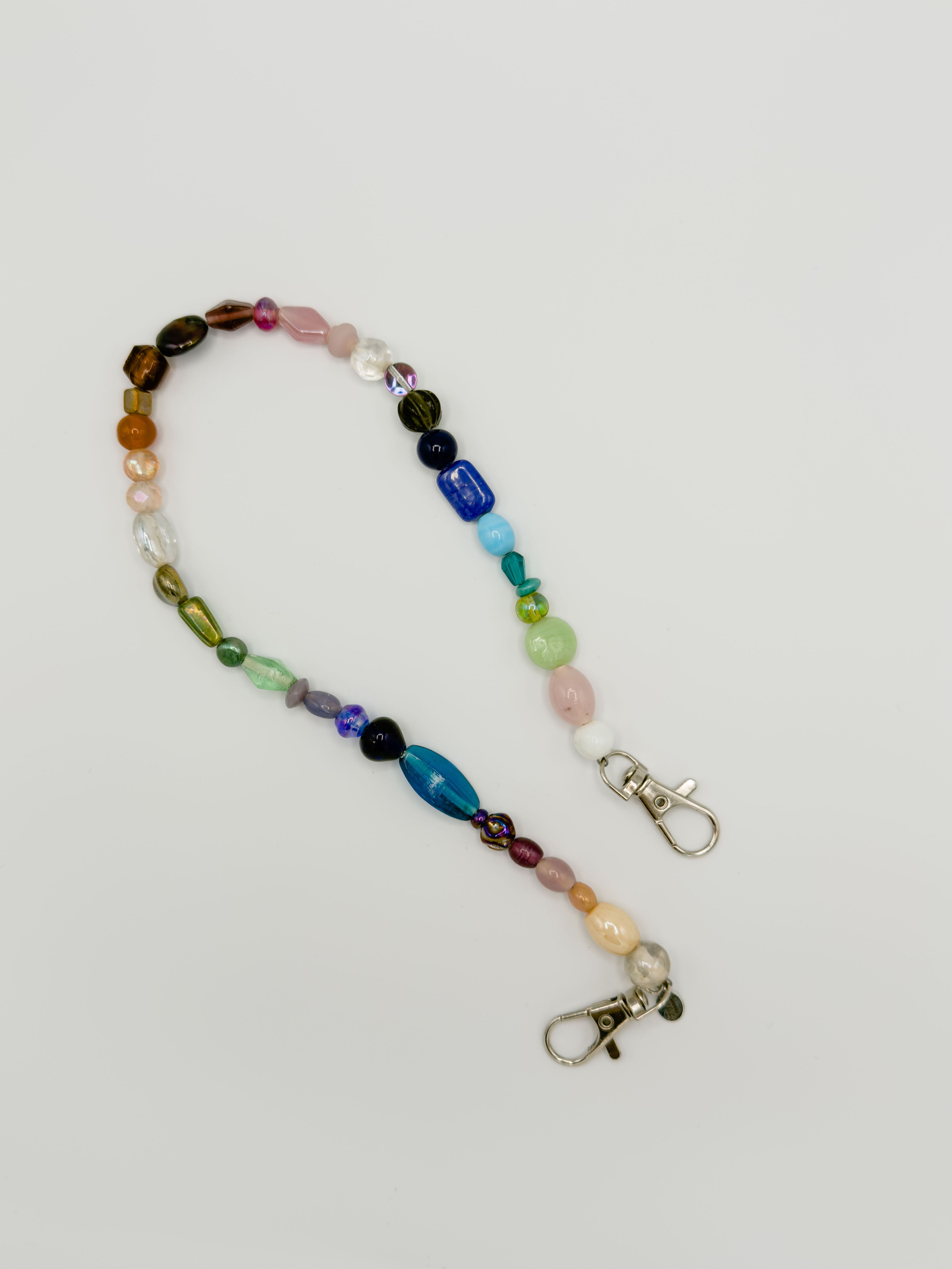 Meet Deirdre. Deirdre is a one-of-one beaded creation that you can clip on your bag, your belt loops, or anywhere you feel needs a little zhuzh-ing. Consists of vintage carnival and czech glass beads of all shapes, sizes, and colors strung on 0.15mm braided metal wiring. On each end are two silver-toned lobster clasps with full rotation for ease of use. Length is 17.5" end to end (clasps included), the beaded portion is 15"